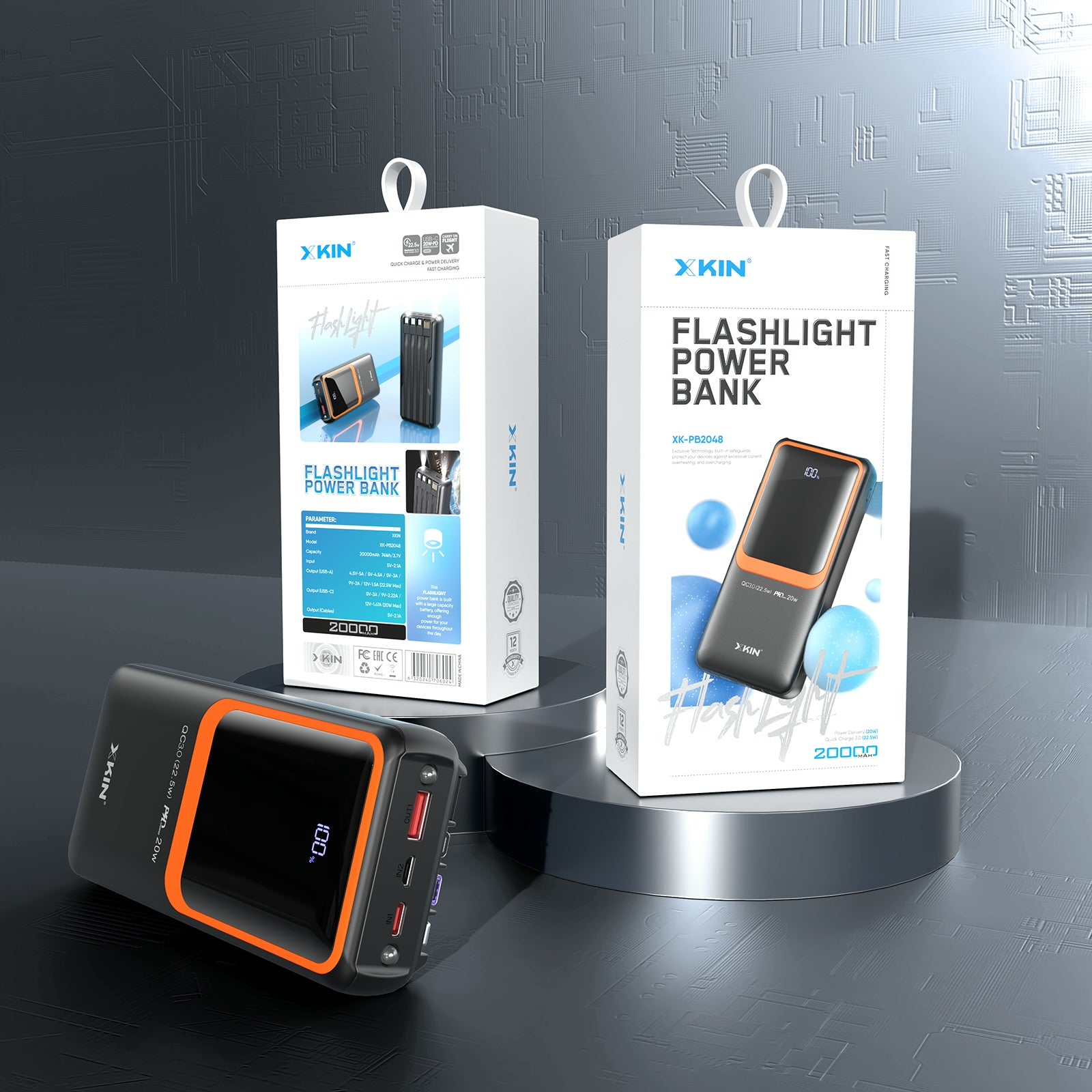 Xkin 20000mAh Power Bank – Built-in USB, 8-Pin, USB-C & Micro USB Cables with Flashlight